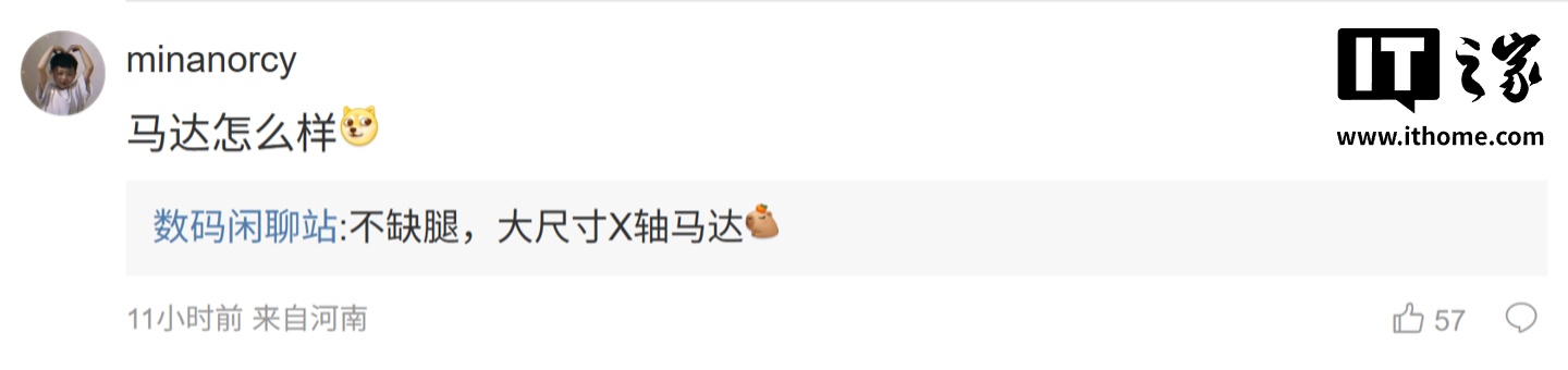 ”;另又名用户则计算谈:“马达若何样”,博主则回应谈:“不缺腿,大尺寸 X 轴马达”。
