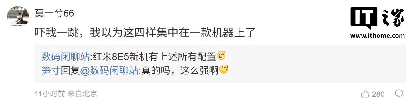 后续灵验户在批驳区暴露:“吓我一跳,我认为这四样结合在一款机器上了”,博主回应谈:“红米 8E5 新机有上述悉数建树