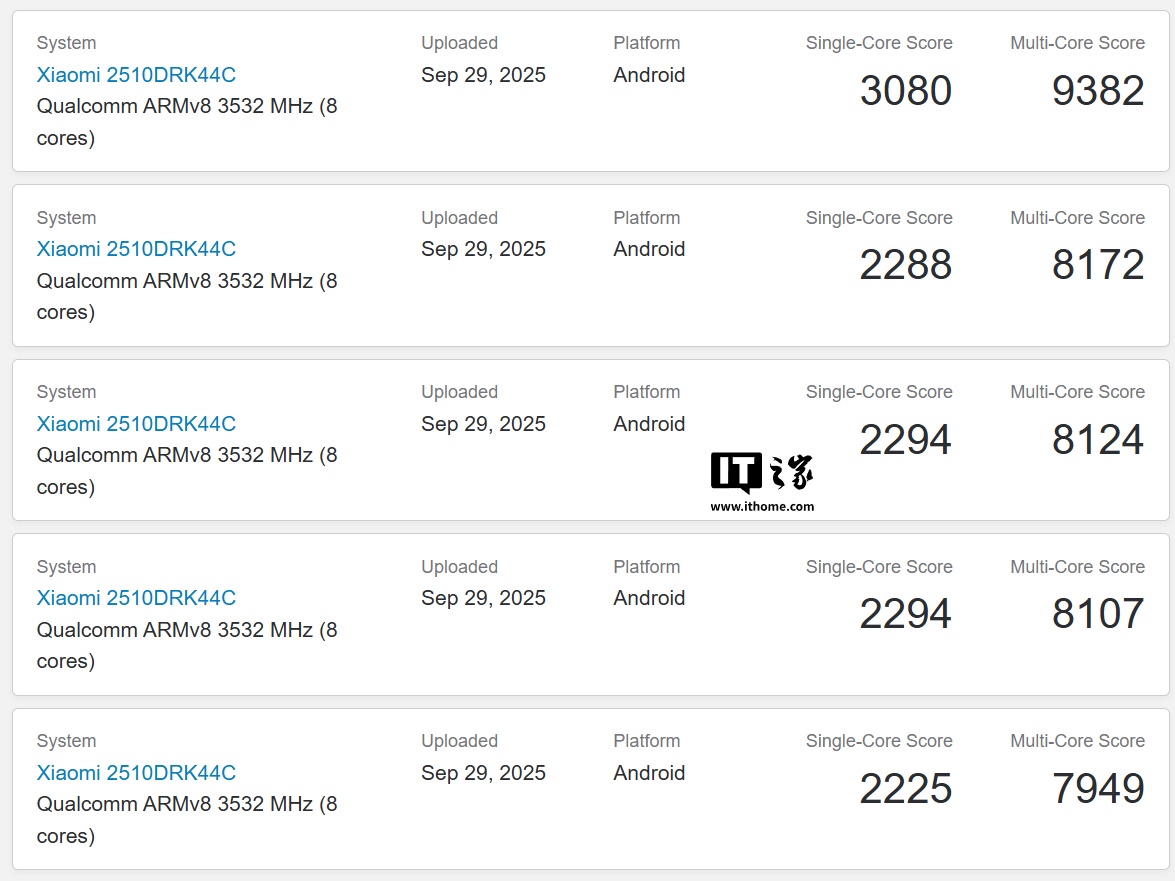 小米 REDMI K90 手机现身 GeekBench 跑分库,型号为“2510DRK44C”,共有 5 条记载,最高跑分为单核 3080 分云开体育,多核 9382 分,从跑分信息来看,这台手机将礼聘高通骁龙 8 至尊版芯片,搭配 Adreno 830 GPU 和 16GB 内存。